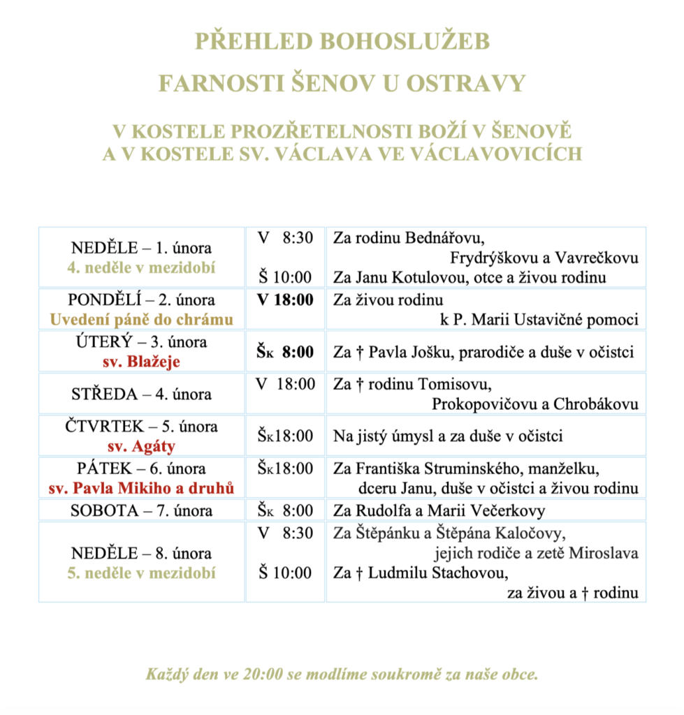 Většina všedních bohoslužeb v Šenově, jsou v zimní kapli – viz rozpis bohoslužeb na nástěnce před kostelem nebo ve Zdroji.